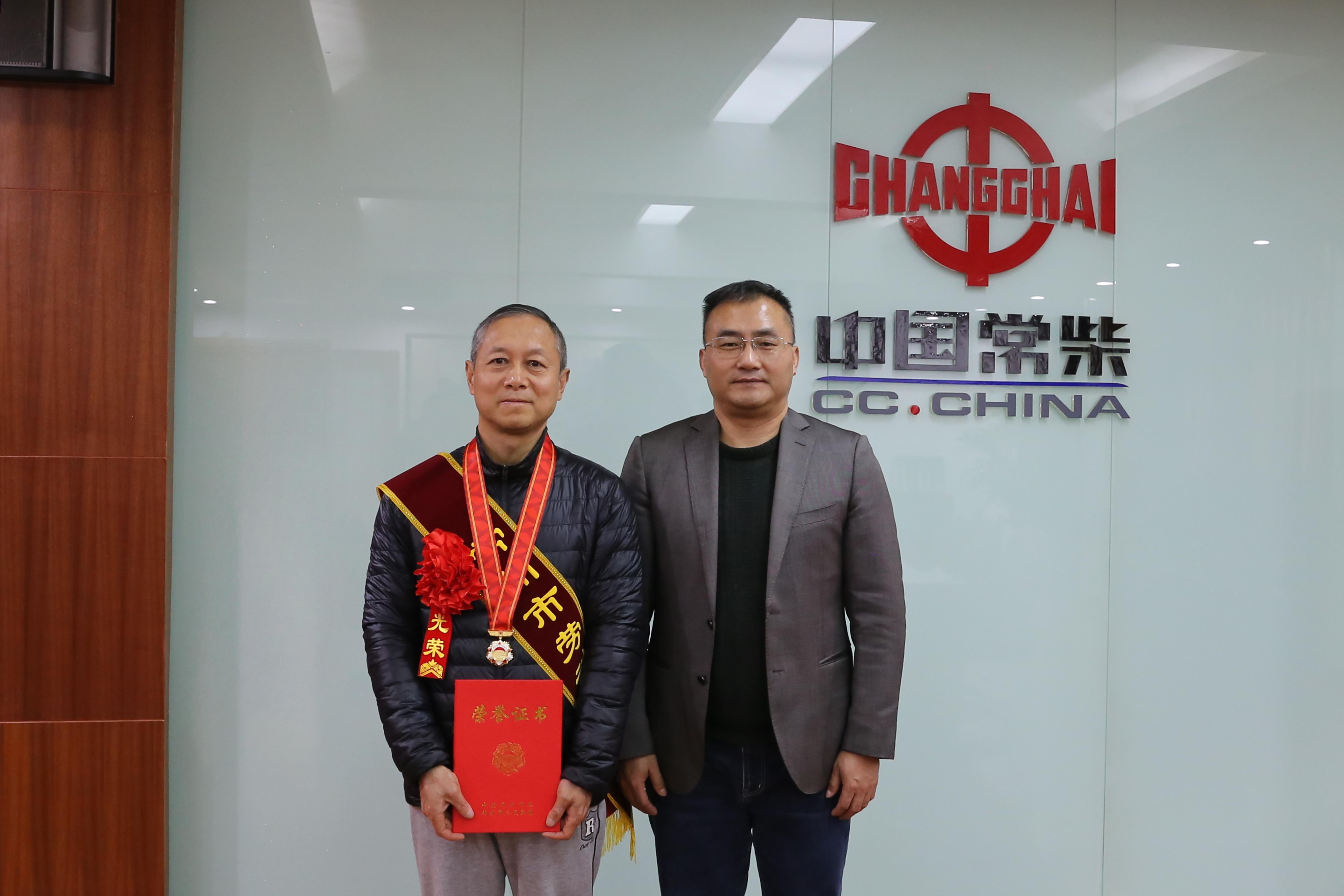 图为公司副总经理、工会主席孙建中(右)为袁文忠颁发荣誉奖章和证书